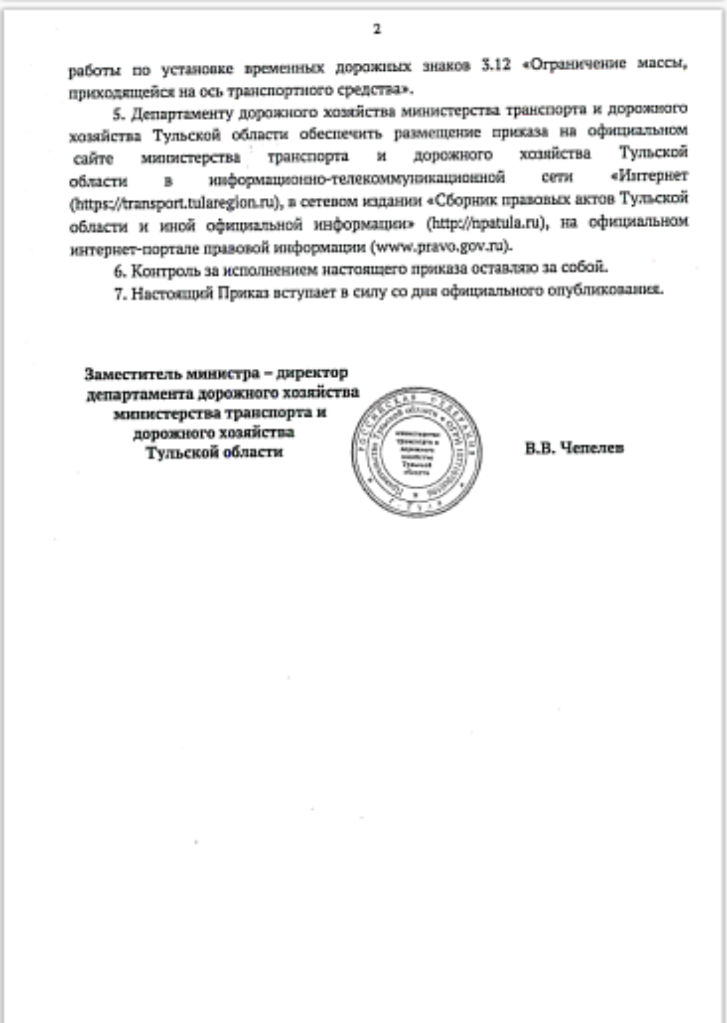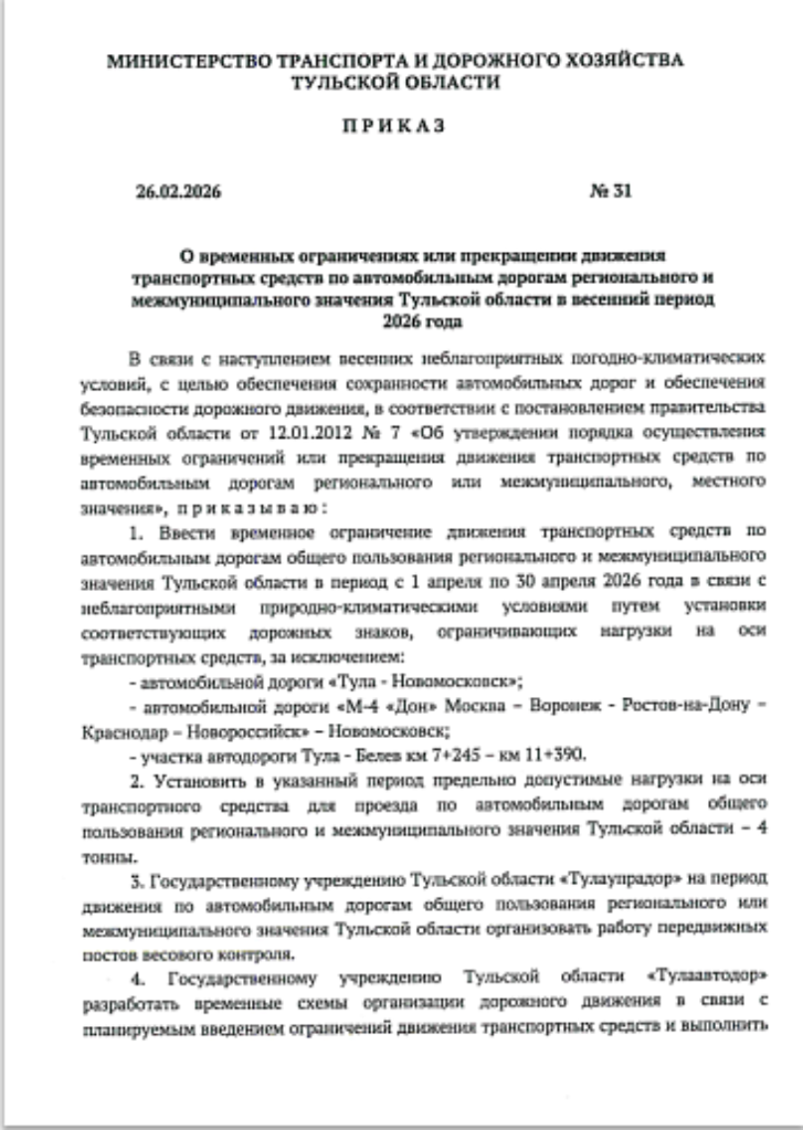 Министерство транспорта и дорожного хозяйства Тульской области информирует участников дорожного движения о введении сезонных ограничений на проезд тяжеловесного транспорта по дорогам регионального и межмуниципального значения.